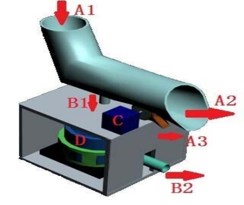 地表水體由 A1 進入管道,經(jīng) A2 流出并推動流量傳感器,部分水體從 A3 排出,處理器 C 根據(jù)流量傳感器得到的流速經(jīng)過計算得出實時流量, B1 采 集到地表水體送入稱重傳感器,傳感器 D 把收集到的數(shù)據(jù)送給處理器 C 經(jīng)處 理后得到泥沙含量,得到數(shù)據(jù)后傳感器 D 把內(nèi)部樣品由 B2 排出為下次采樣做